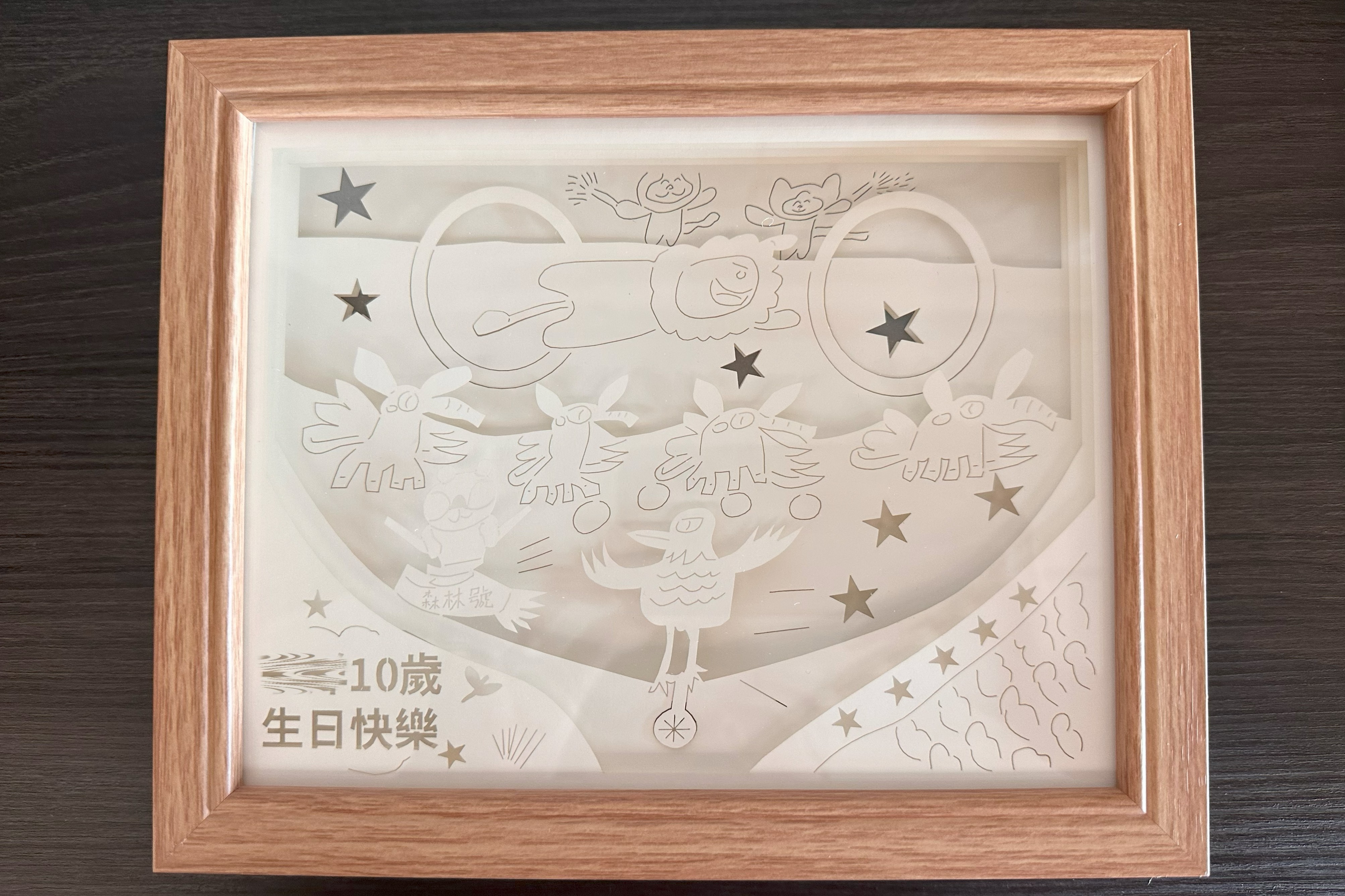 剛好作品完成時接近孩子生日,我們特別在左下角刻上「生日快樂」,為這段成長回憶留下專屬註解。