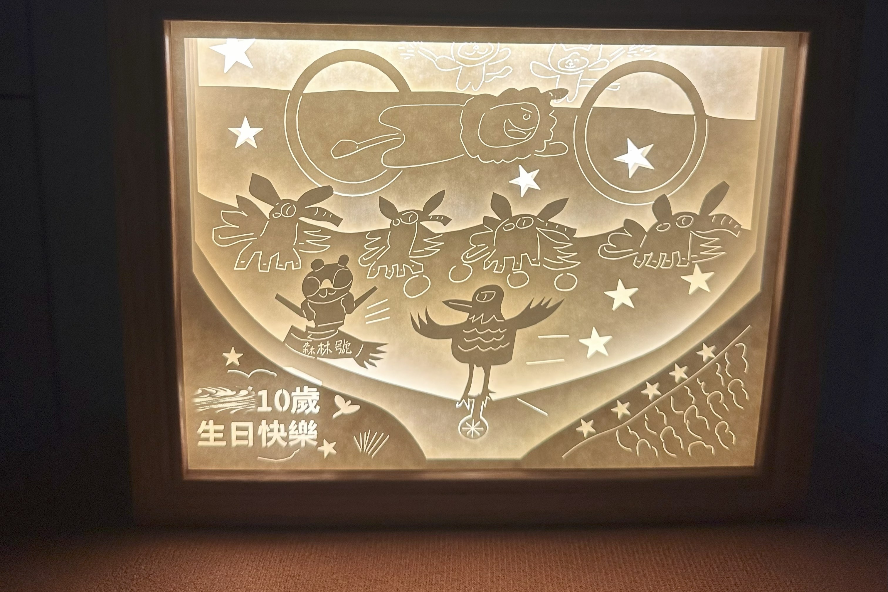 未來每一盞紙雕燈箱,都能依需求刻上不同字句,把童年最珍貴的想像,收藏進這個會發光的小劇場裡。