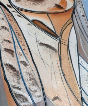 層層堆疊的紋理與手工筆觸,呈現如壁畫般的立體感。
