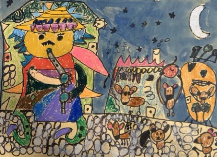 在孩子的蠟筆畫中,吹笛的旅人帶著小老鼠穿越星空街道,
