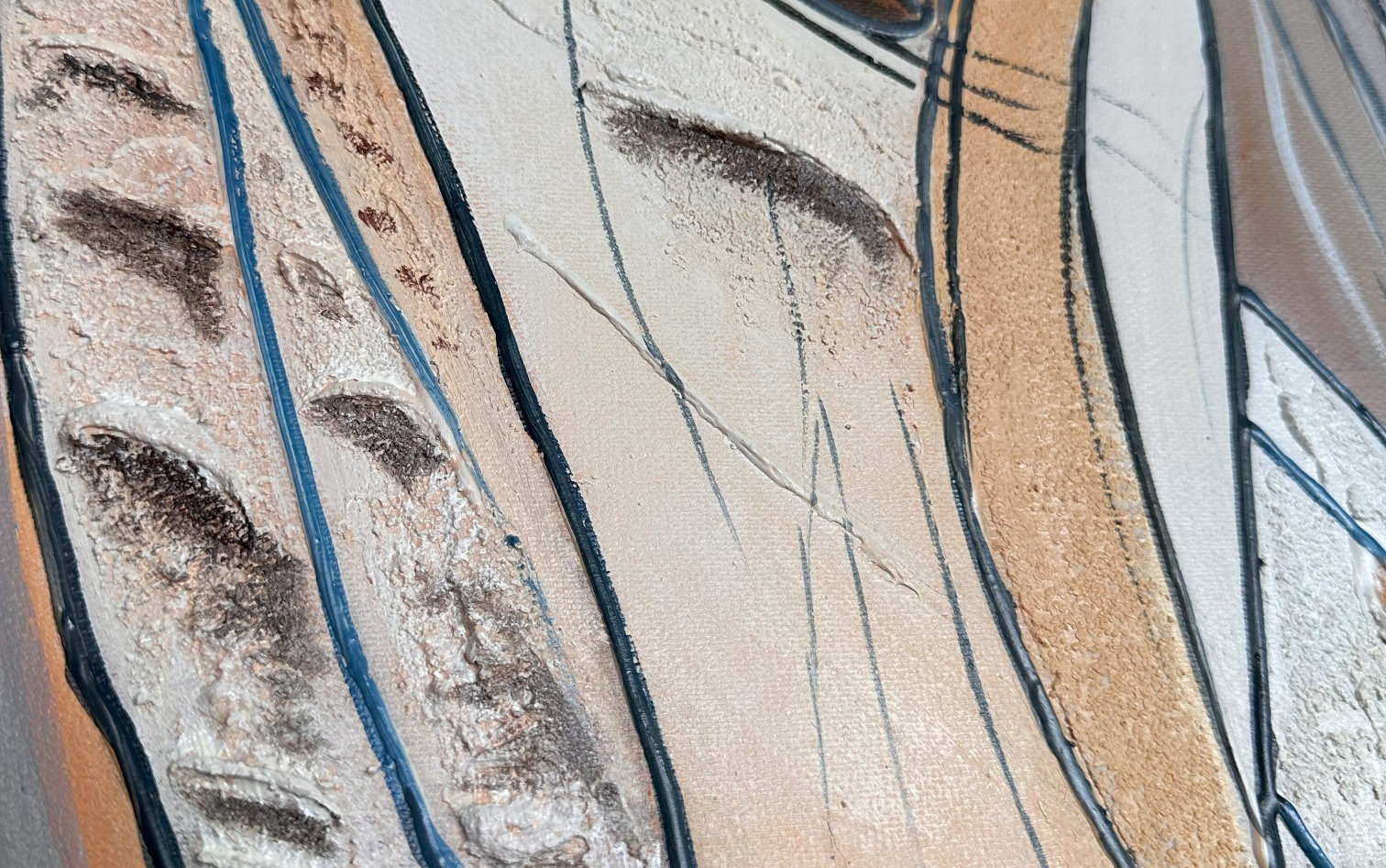 砂岩畫,是一種利用不同色彩、質地的天然砂石和植物材料,通過分層堆疊、固定於基底上而形成的藝術形式,具有獨特的紋理色彩,摸起來觸感細膩,表面呈現出一種獨特的顆粒感紋理。