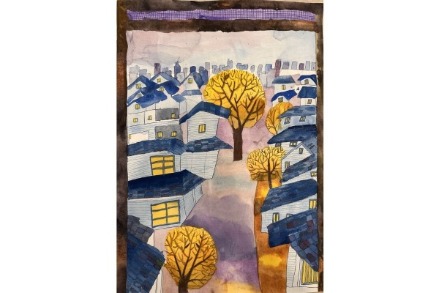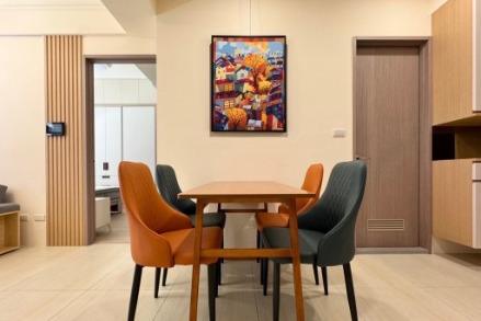 良好的體驗讓家長再次託付另一幅孩子 8 歲的水彩畫。作品中藍色屋瓦與金黃樹木的對比,展現孩子細膩的觀察力。我們在保留原作神韻的同時,強化色彩與層次,完成後的畫作也順利進駐餐廳,為空間增添一抹靜謐卻明亮的風景。