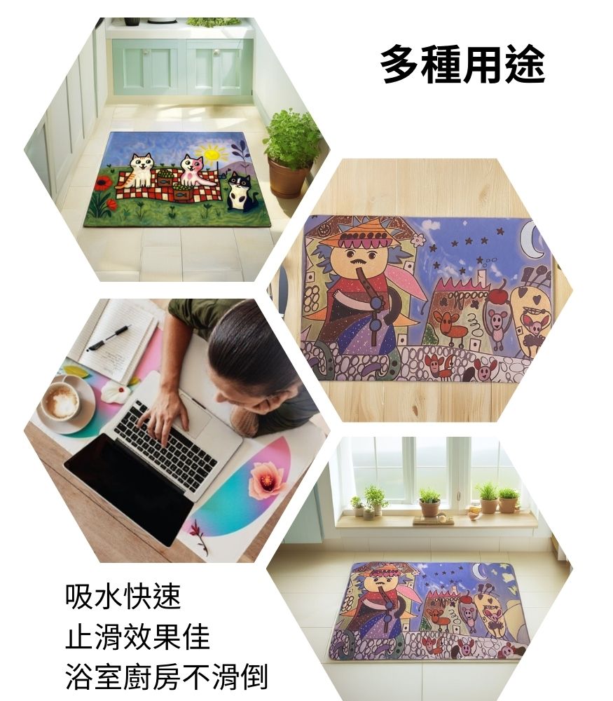 選用天然珪藻土混合柔韌材質製作,兼具吸水、速乾、防滑與耐用特性。可作為地墊、桌墊、寵物墊或浴室腳墊,讓創作融入生活的每一個角落。印製採用環保工藝,色彩清晰不易褪色,讓作品在日常中持續綻放。
