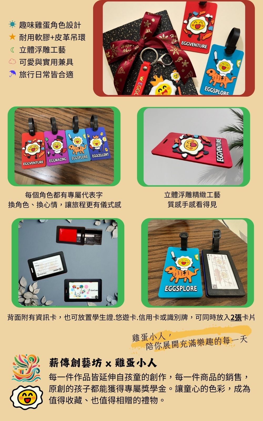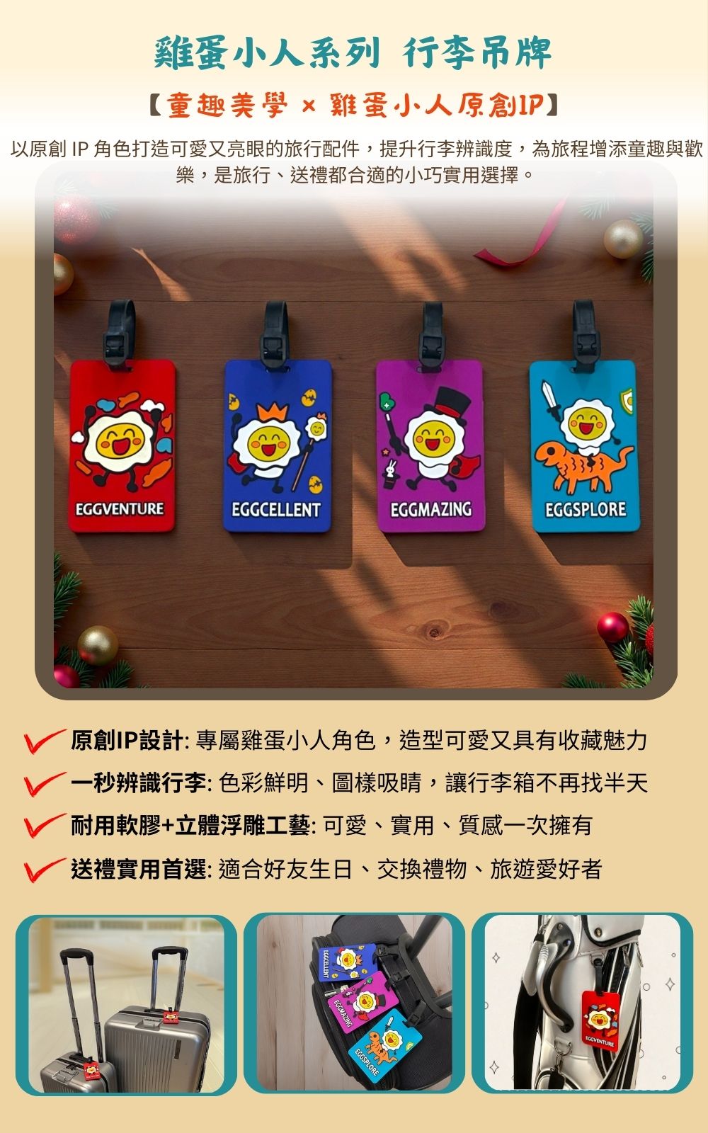 以原創 IP 角色《雞蛋小人系列 Egg Friends》打造可愛又亮眼的旅行配件,提升行李辨識度,為旅程增添童趣與歡樂,是旅行、送禮都合適的小巧實用選擇。