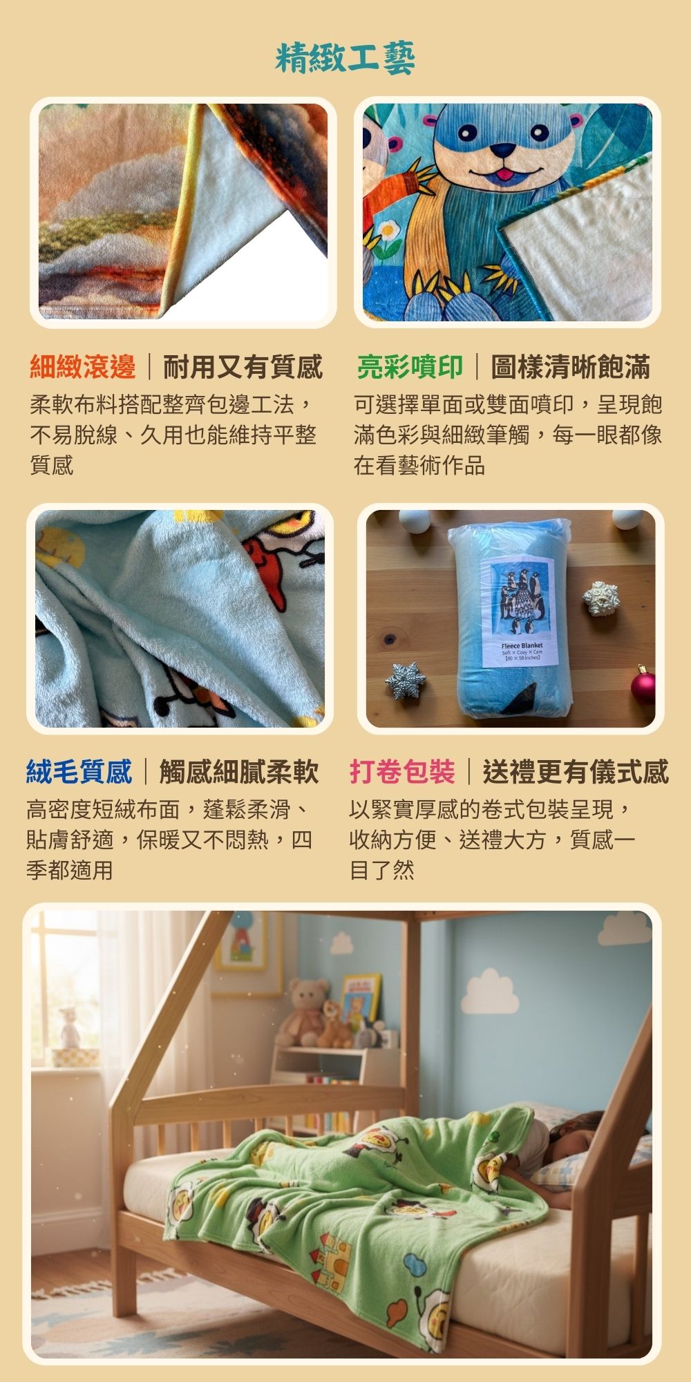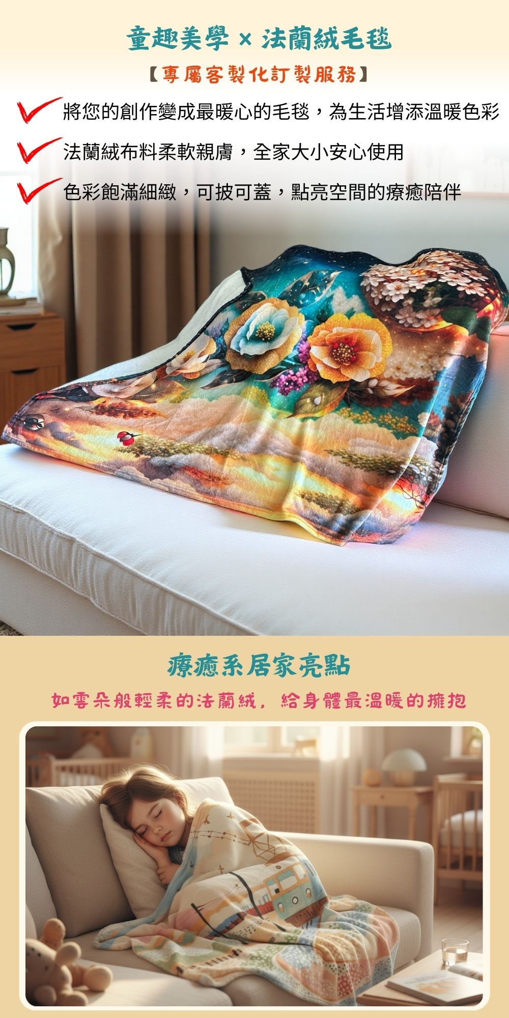 將孩子、家人或個人的創作,化為一條獨一無二的法蘭絨毛毯。