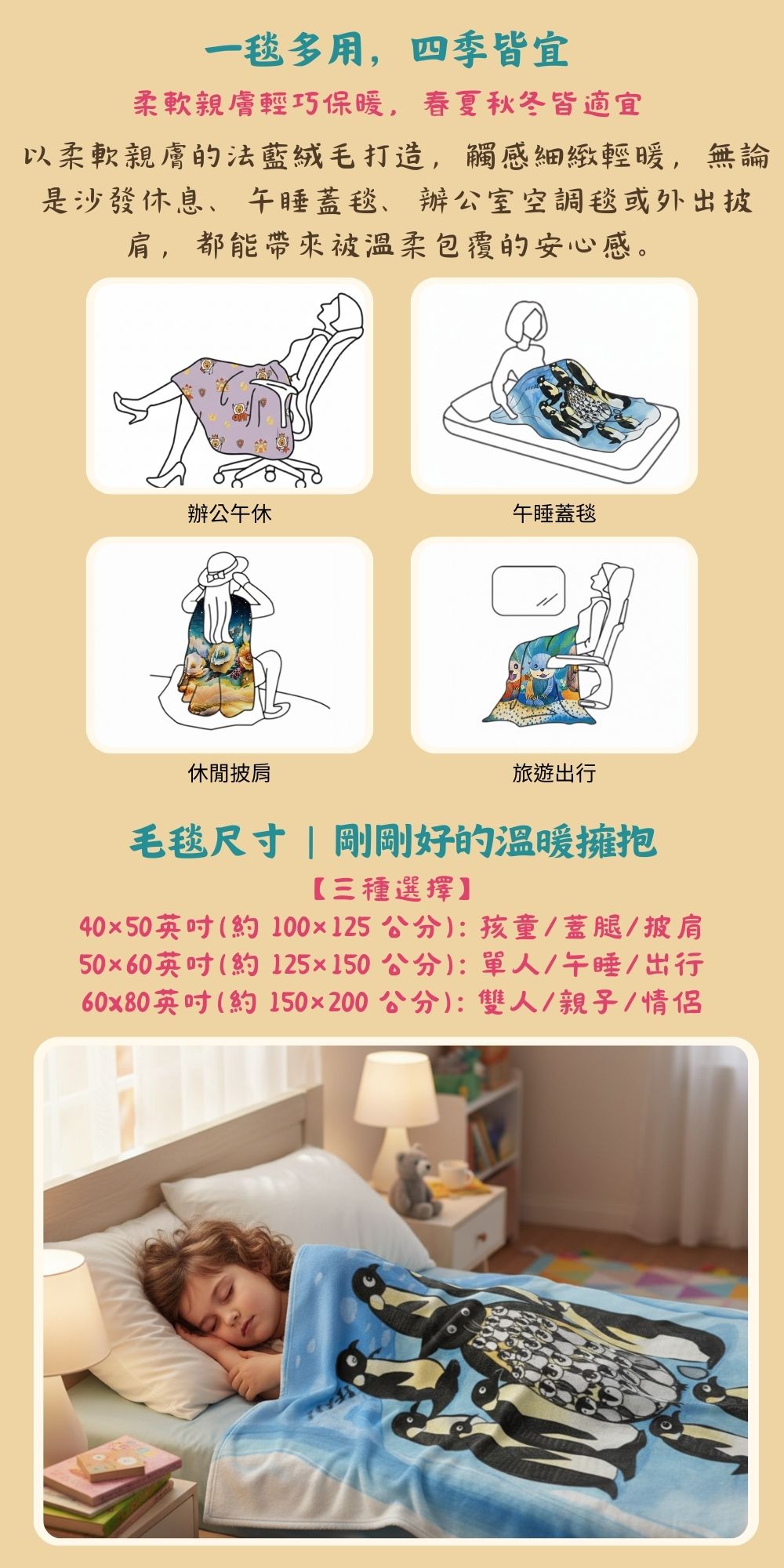 ✨ 一毯多用設計:居家、午睡、空調披肩、旅行保暖,一條搞定