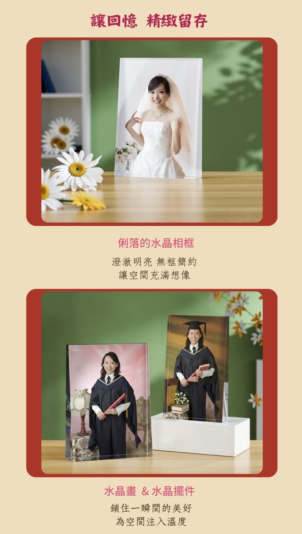 將珍貴的創作或照片,化為晶透的水晶畫與水晶擺件,讓回憶在日常光影中長久綻放。