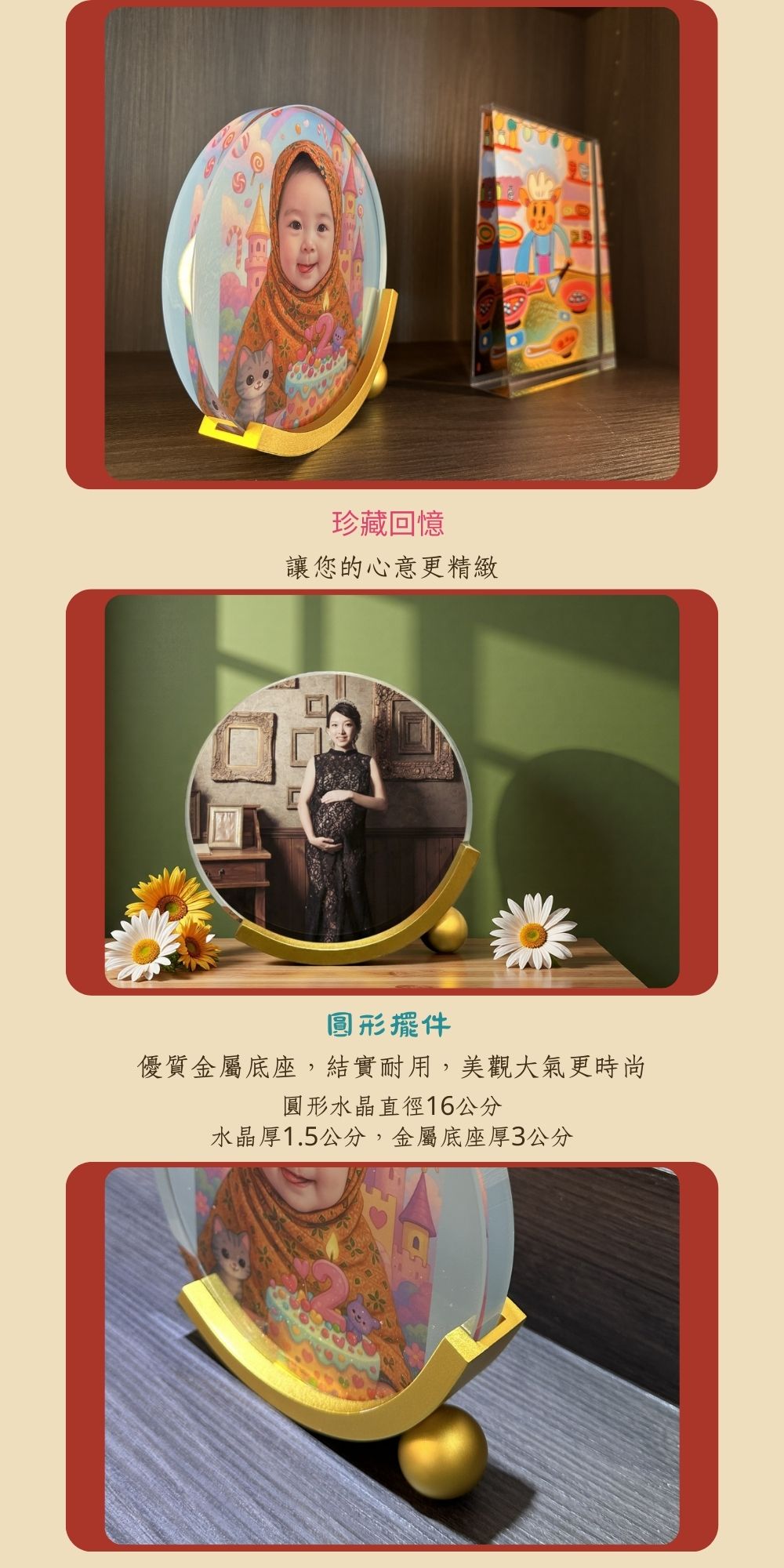 選用高透光的壓克力材質,細緻呈現影像的色彩層次與細節。透過光線折射,作品展現如浮雕般的立體質感,可作為桌上擺飾、紀念禮品或收藏小物,讓愛與美好時光長久留存。