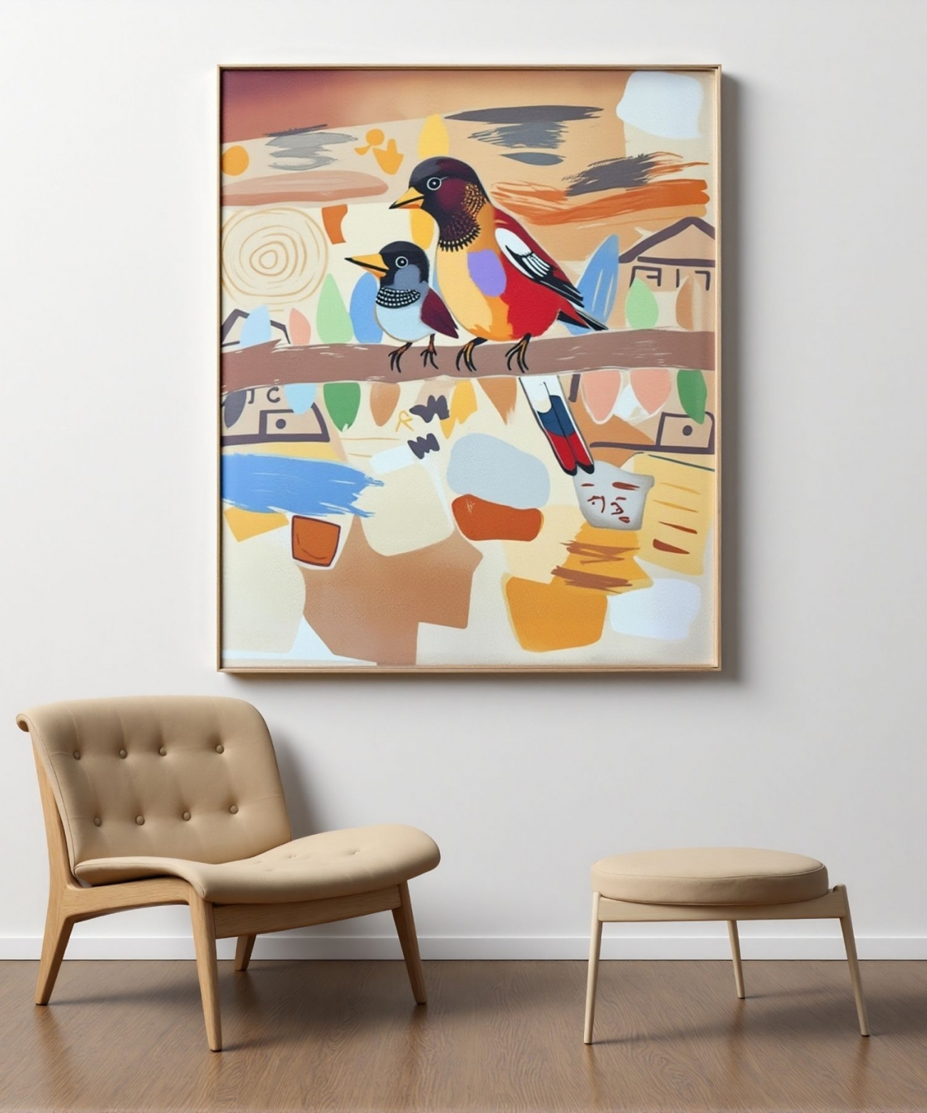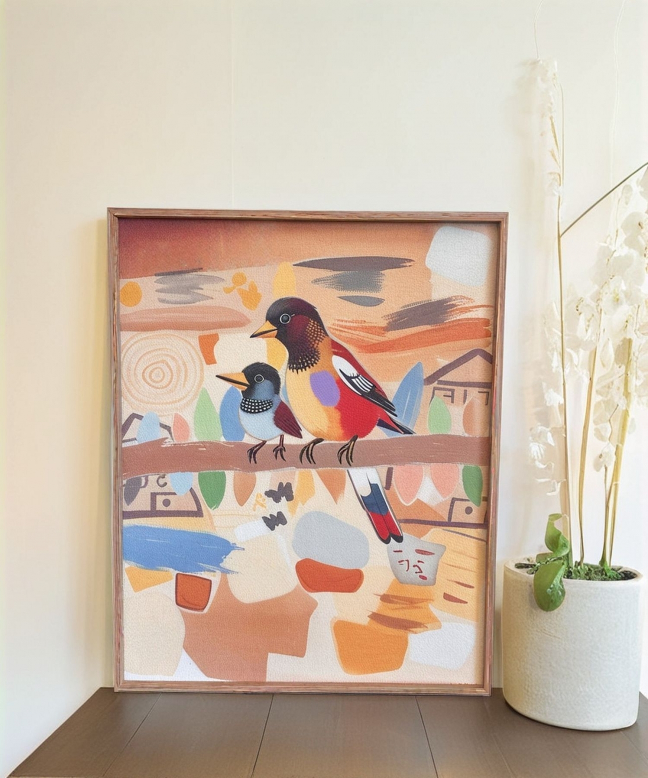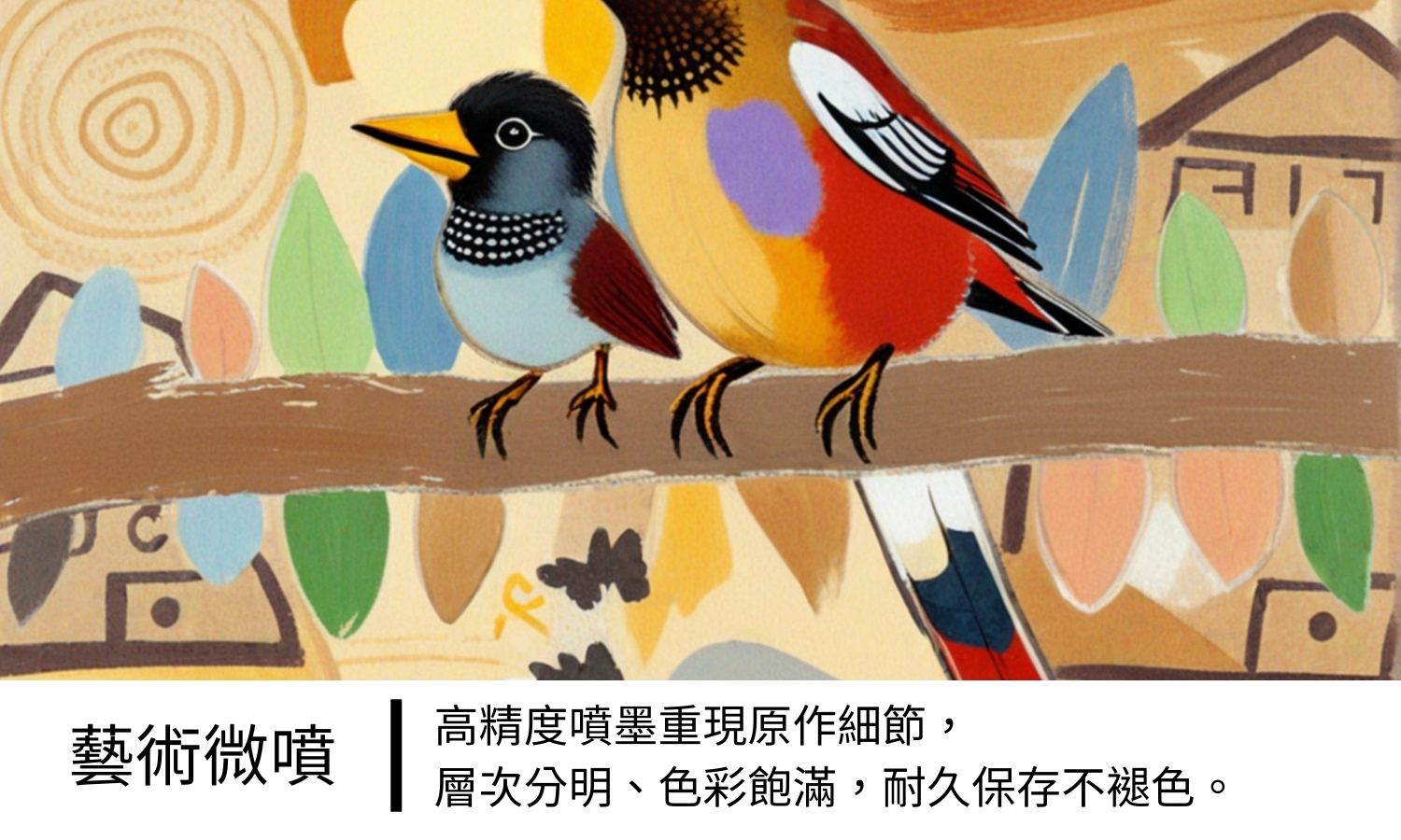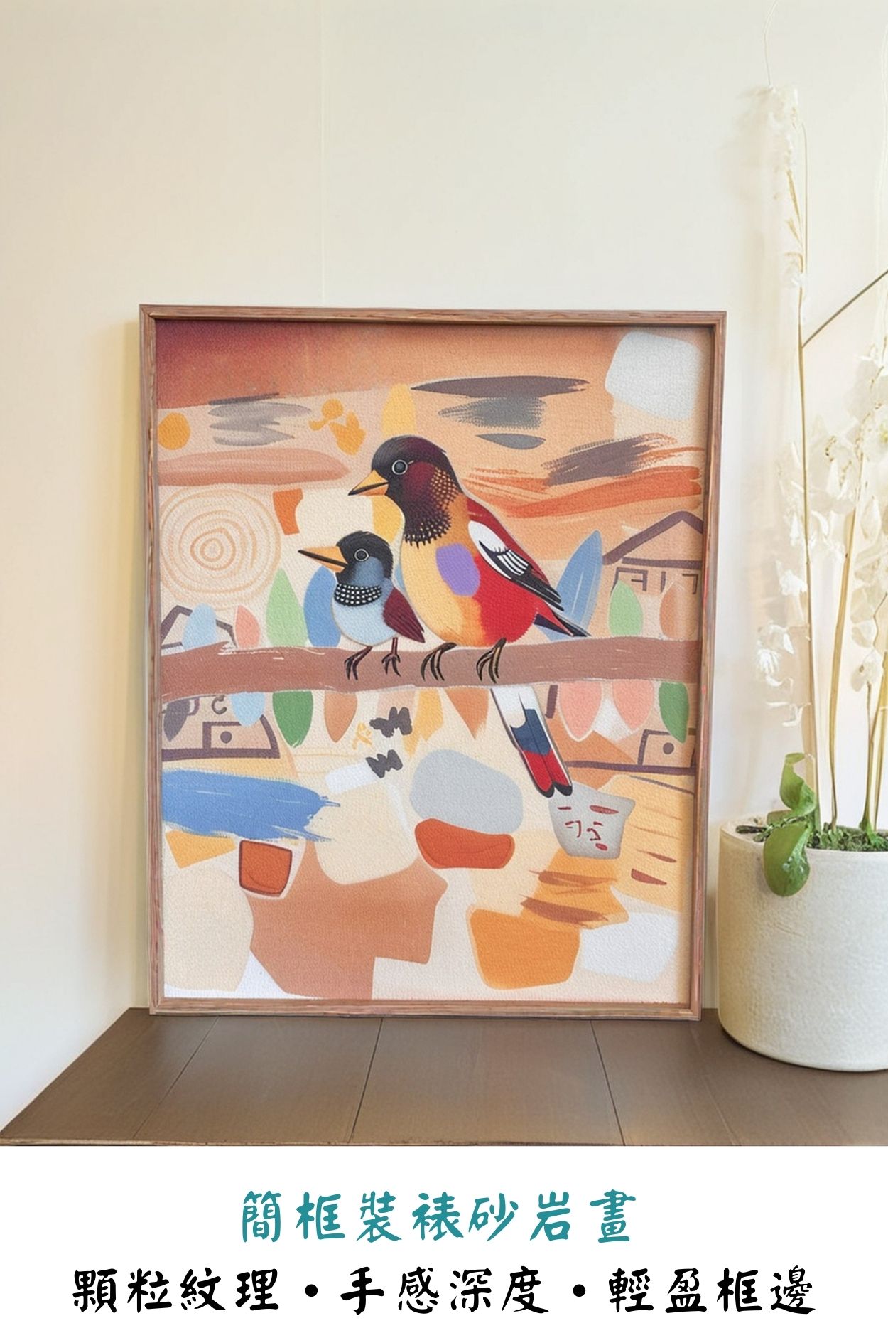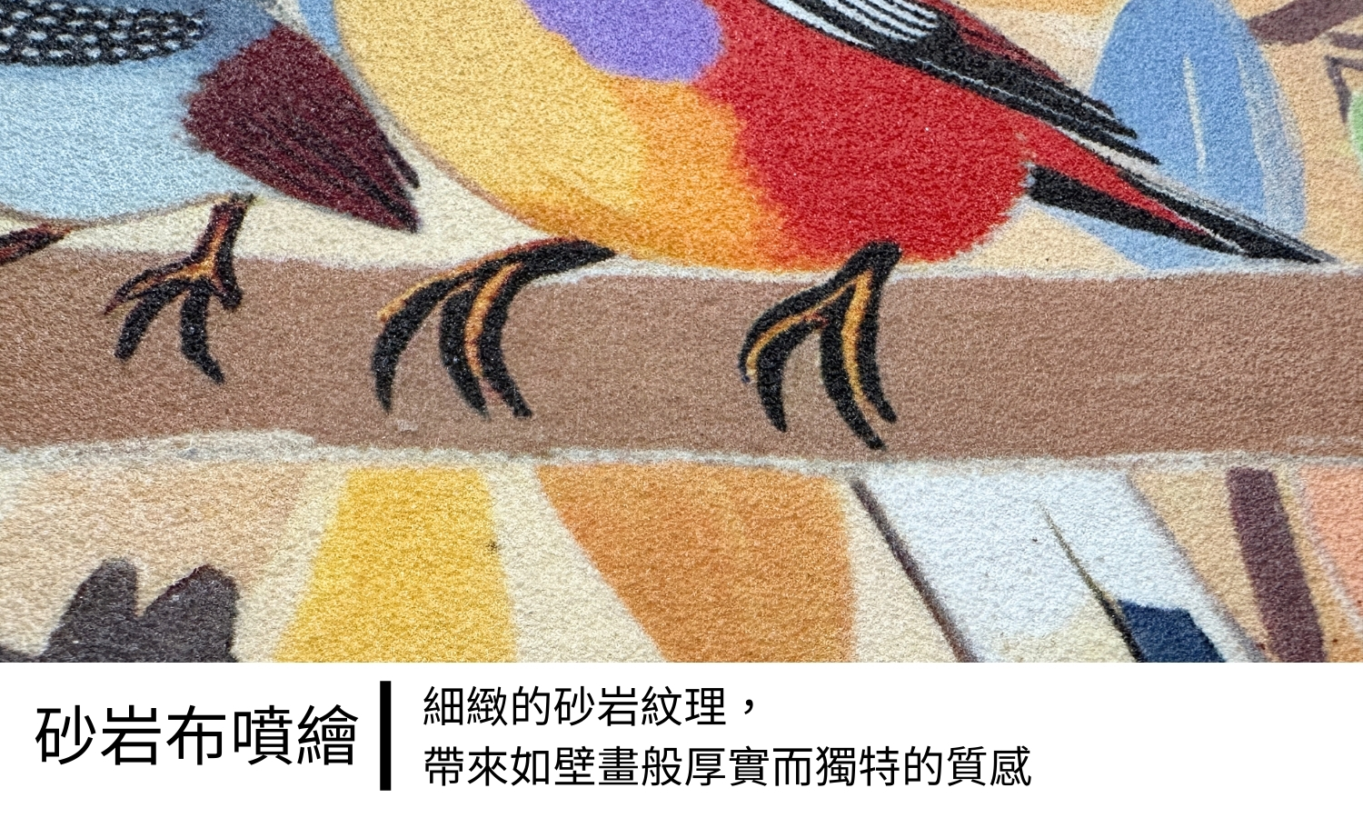 描繪一大一小兩隻鳥兒停在枝頭,彷彿在低聲交談,訴說屬於牠們的故事。奶油色調交疊出的背景,如同詩歌般流淌,帶來如拼貼般的律動感。畫面筆觸溫柔細膩,保留孩童塗鴉的純真與幻想,營造出親暱、溫暖又帶點夢幻的氛圍。這幅噴繪砂岩畫不僅是視覺藝術,更像一段歌聲,讓人駐足於詩意與童真的交織之中。