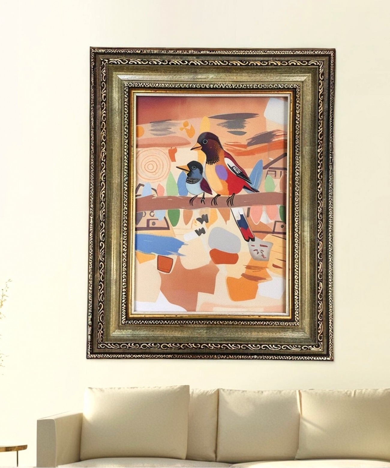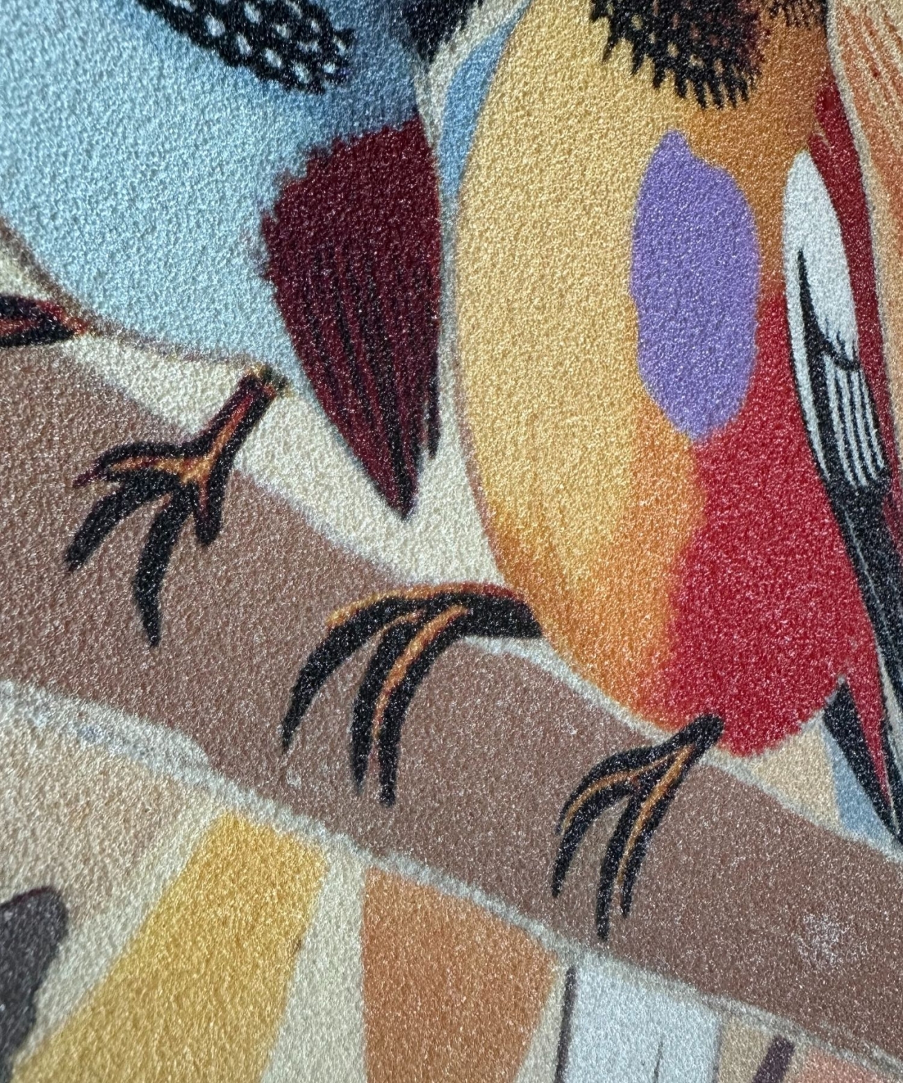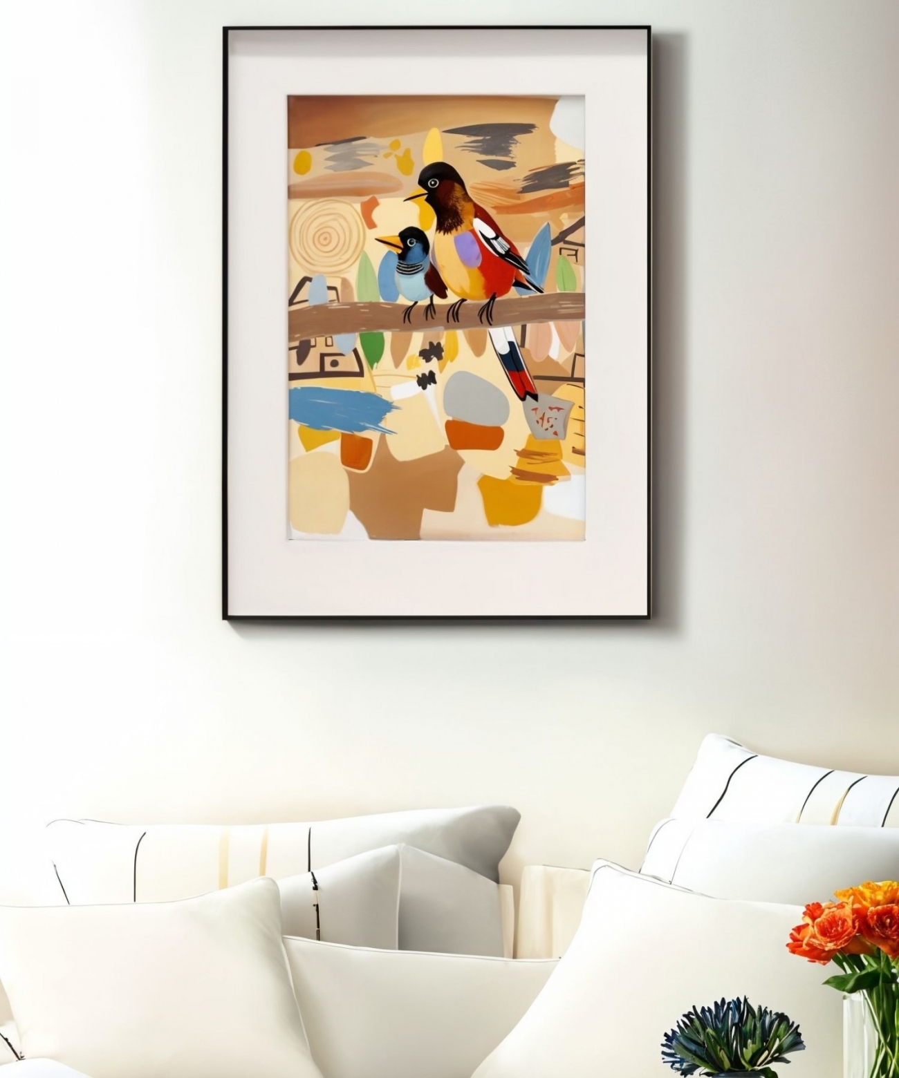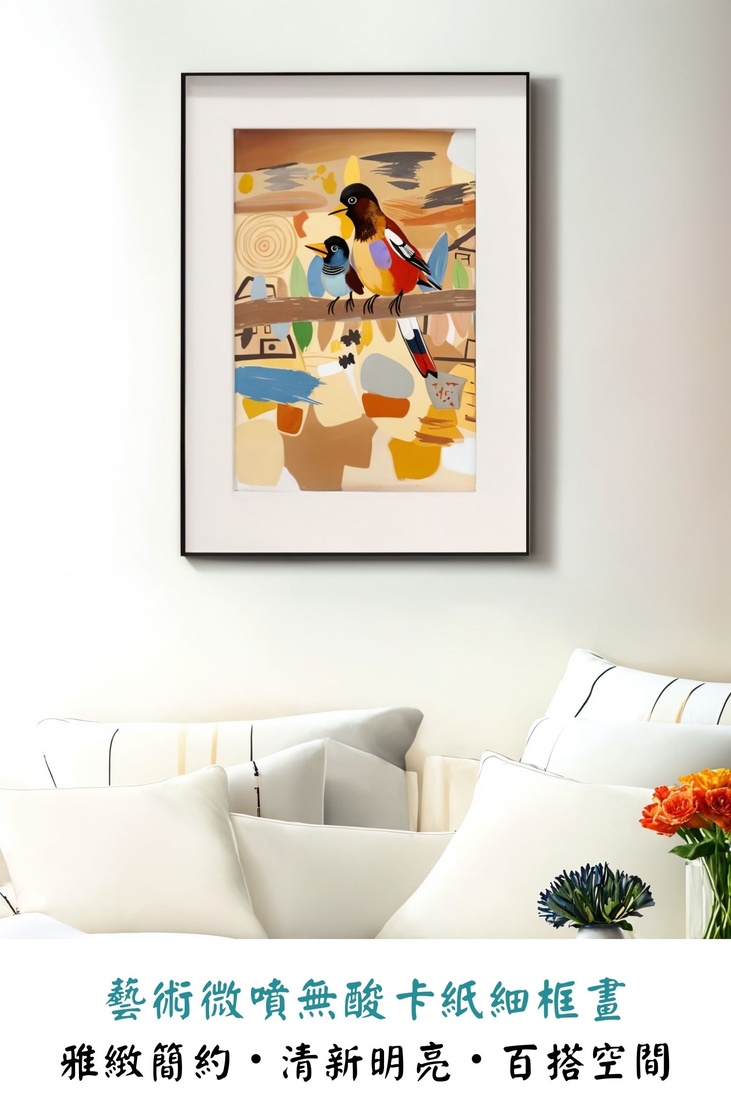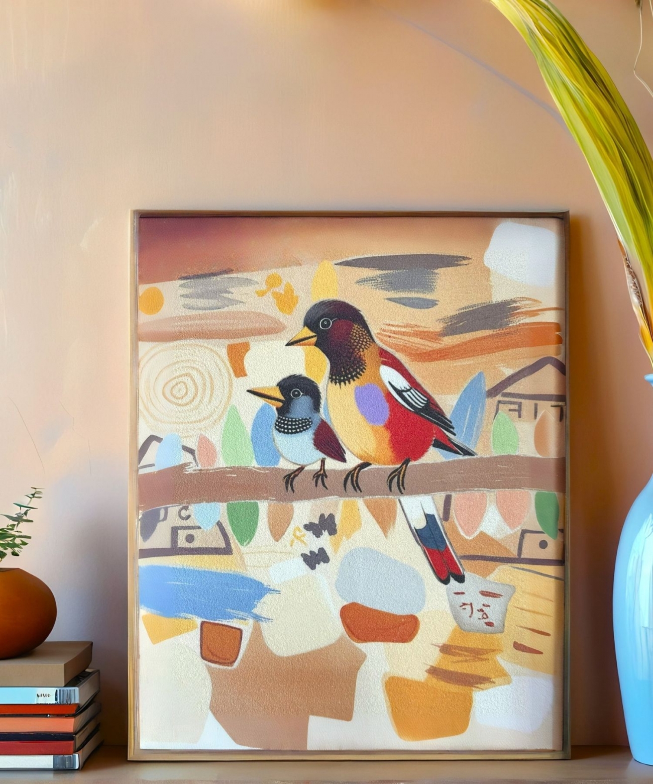 描繪一大一小兩隻鳥兒停在枝頭,彷彿在低聲交談,訴說屬於牠們的故事。奶油色調交疊出的背景,如同詩歌般流淌,帶來如拼貼般的律動感。畫面筆觸溫柔細膩,保留孩童塗鴉的純真與幻想,營造出親暱、溫暖又帶點夢幻的氛圍。這幅噴繪砂岩畫不僅是視覺藝術,更像一段歌聲,讓人駐足於詩意與童真的交織之中。