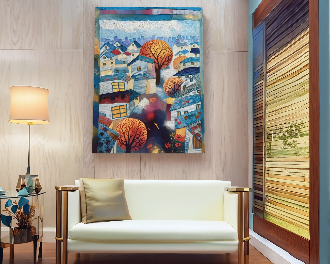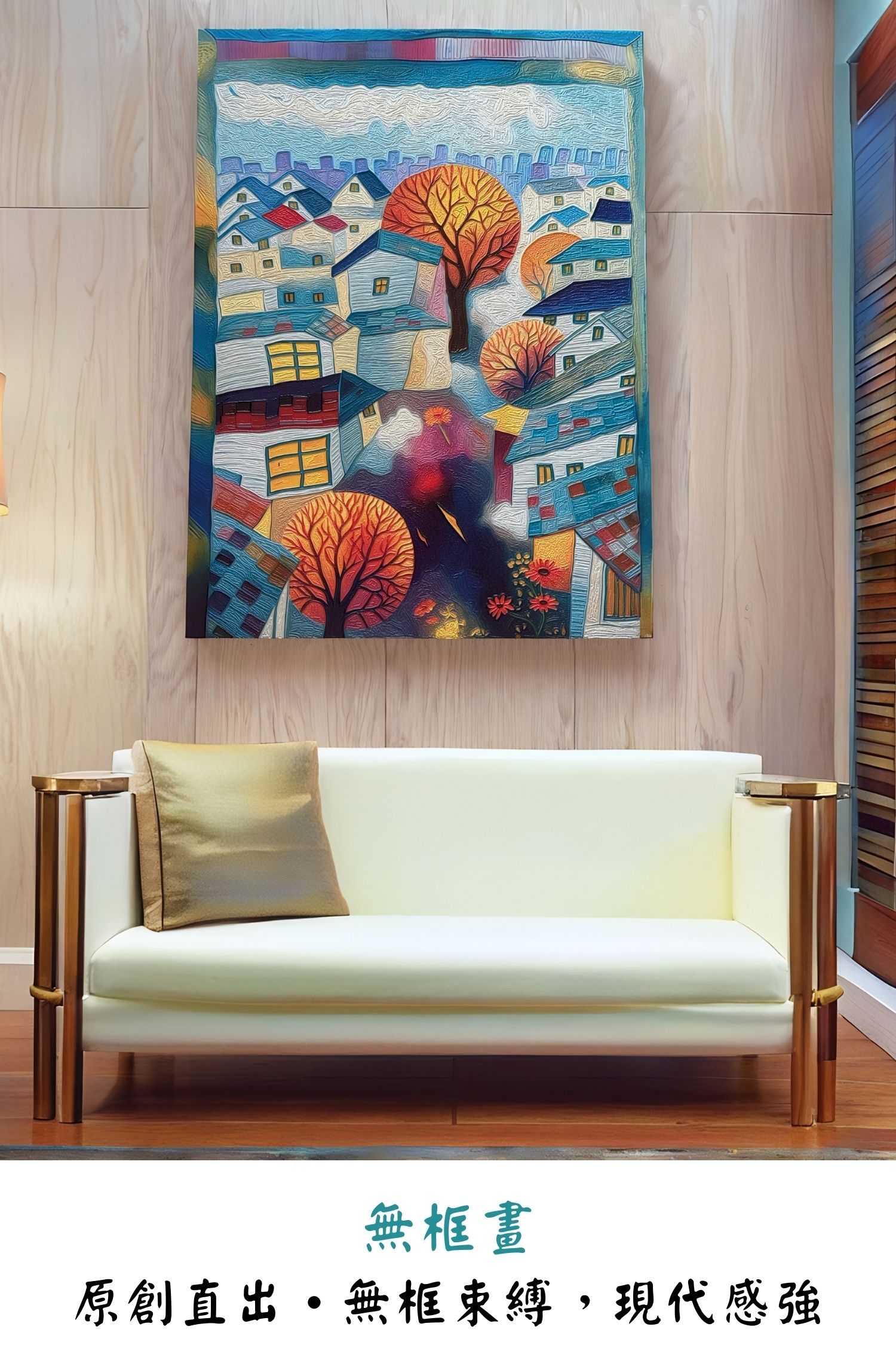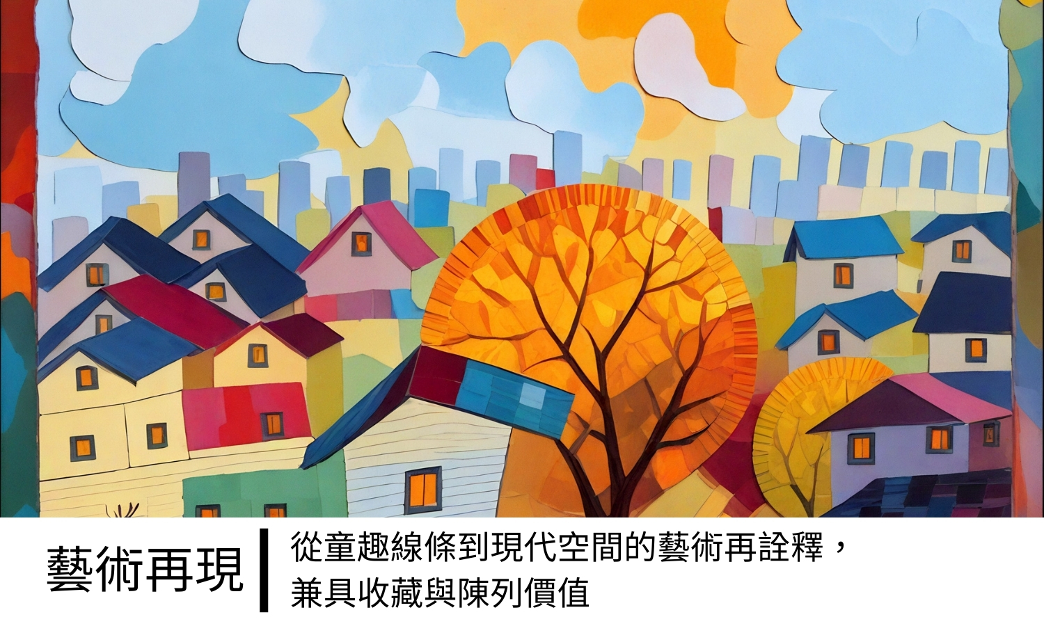 描繪了一個靜靜發光的小鎮,屋簷、窗光與街樹交織成詩意畫面。俯視的構圖中,小屋如積木般錯落堆疊,透光的窗戶宛若守護夜晚的眼睛。鮮紅與橘黃的樹木在冷暖交錯的色調中跳動,如同城市的心跳。畫風融合現代抽象與童年塗鴉,線條奔放、色塊堆疊,讓觀者在秩序與童趣間,重拾純真的記憶與想像。
