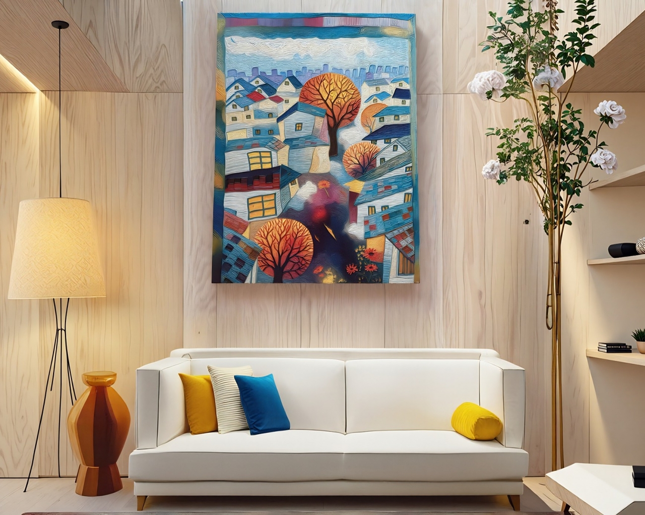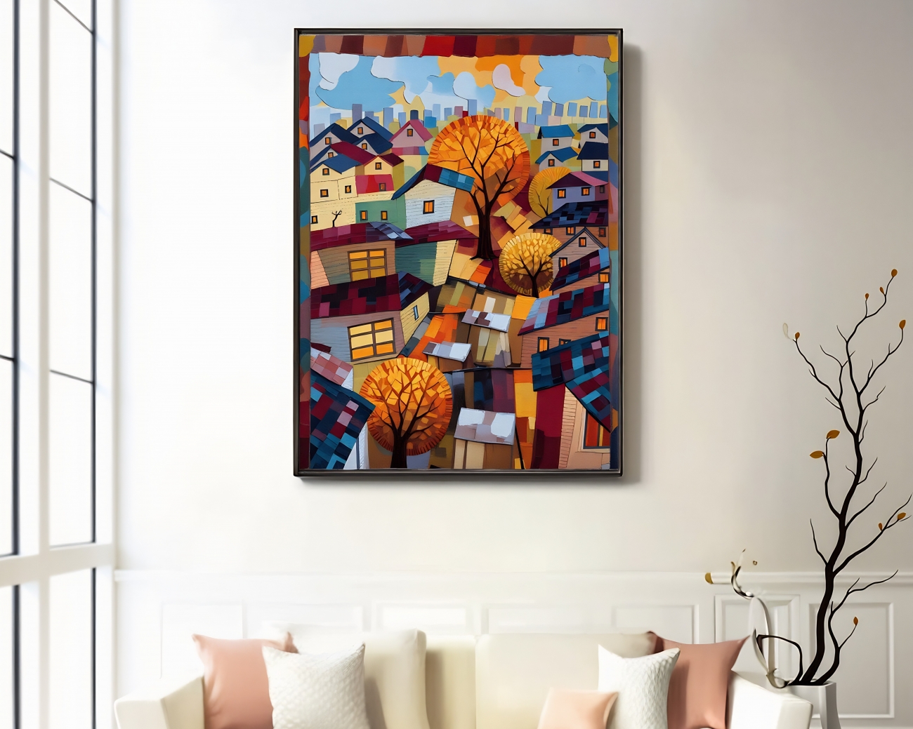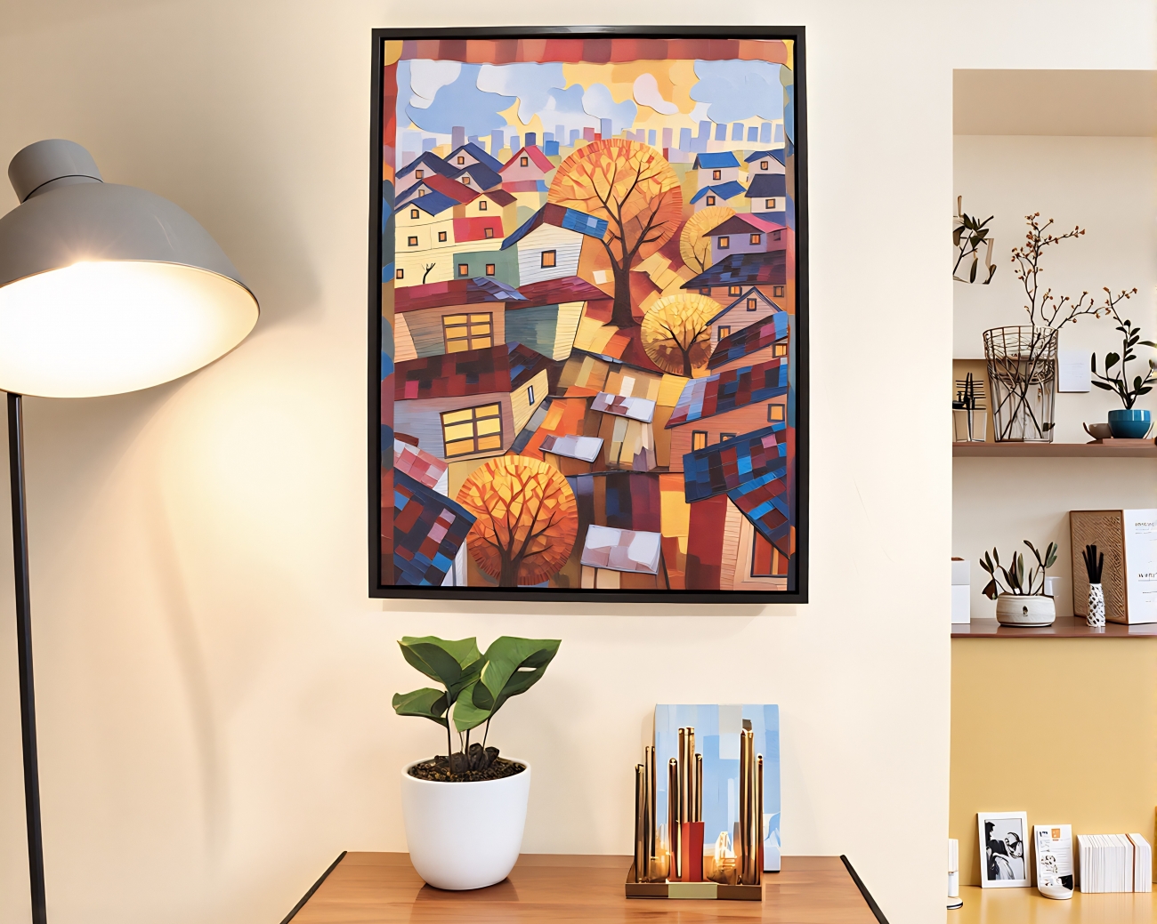 描繪了一個靜靜發光的小鎮,屋簷、窗光與街樹交織成詩意畫面。俯視的構圖中,小屋如積木般錯落堆疊,透光的窗戶宛若守護夜晚的眼睛。鮮紅與橘黃的樹木在冷暖交錯的色調中跳動,如同城市的心跳。畫風融合現代抽象與童年塗鴉,線條奔放、色塊堆疊,讓觀者在秩序與童趣間,重拾純真的記憶與想像。