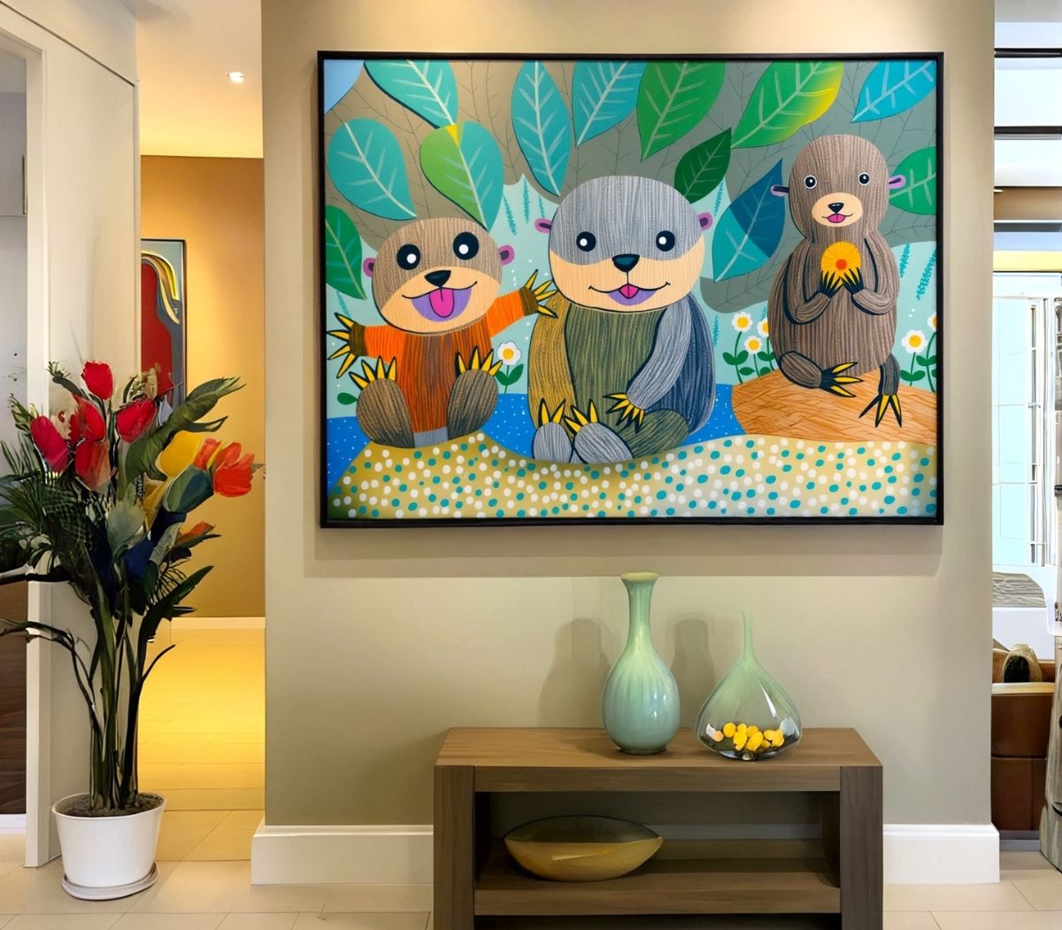以簡潔明快的構圖描繪三隻海獺的可愛姿態:張開雙臂的歡呼、微笑凝視的陪伴、輕聲低語的小花時光。畫面沒有繁複的動作,卻蘊含豐富的情感語言。鮮明的色彩與俏皮的筆觸交織出一份純粹的快樂,讓人感受到「友誼、自然與當下」的美好力量。無論是大幅掛畫營造空間亮點,或小幅作品點綴角落,都能為生活注入溫暖與童趣。