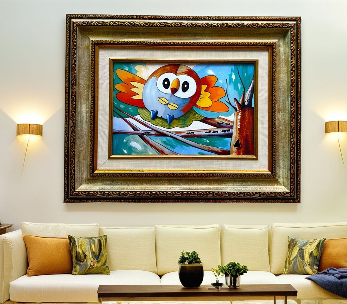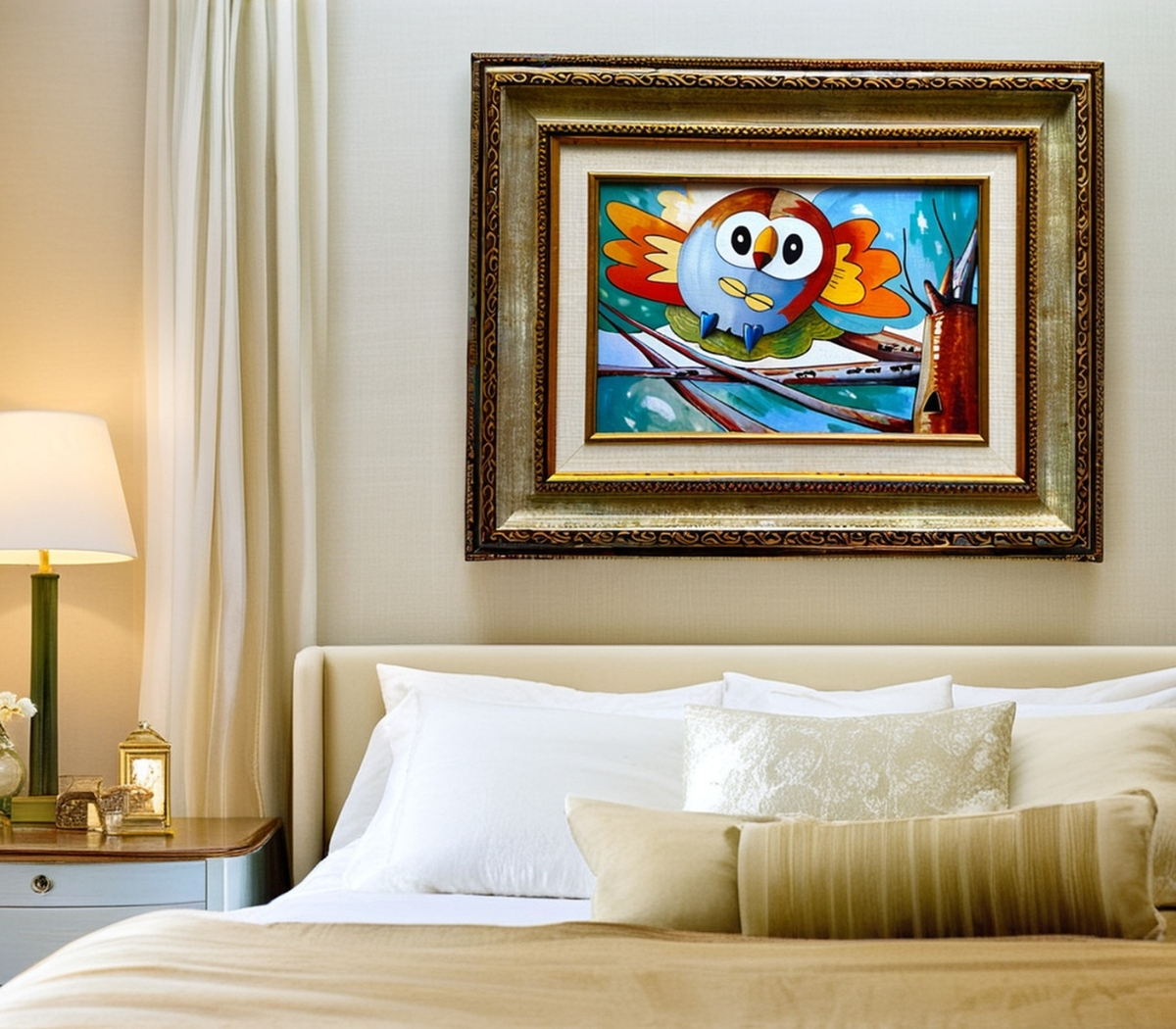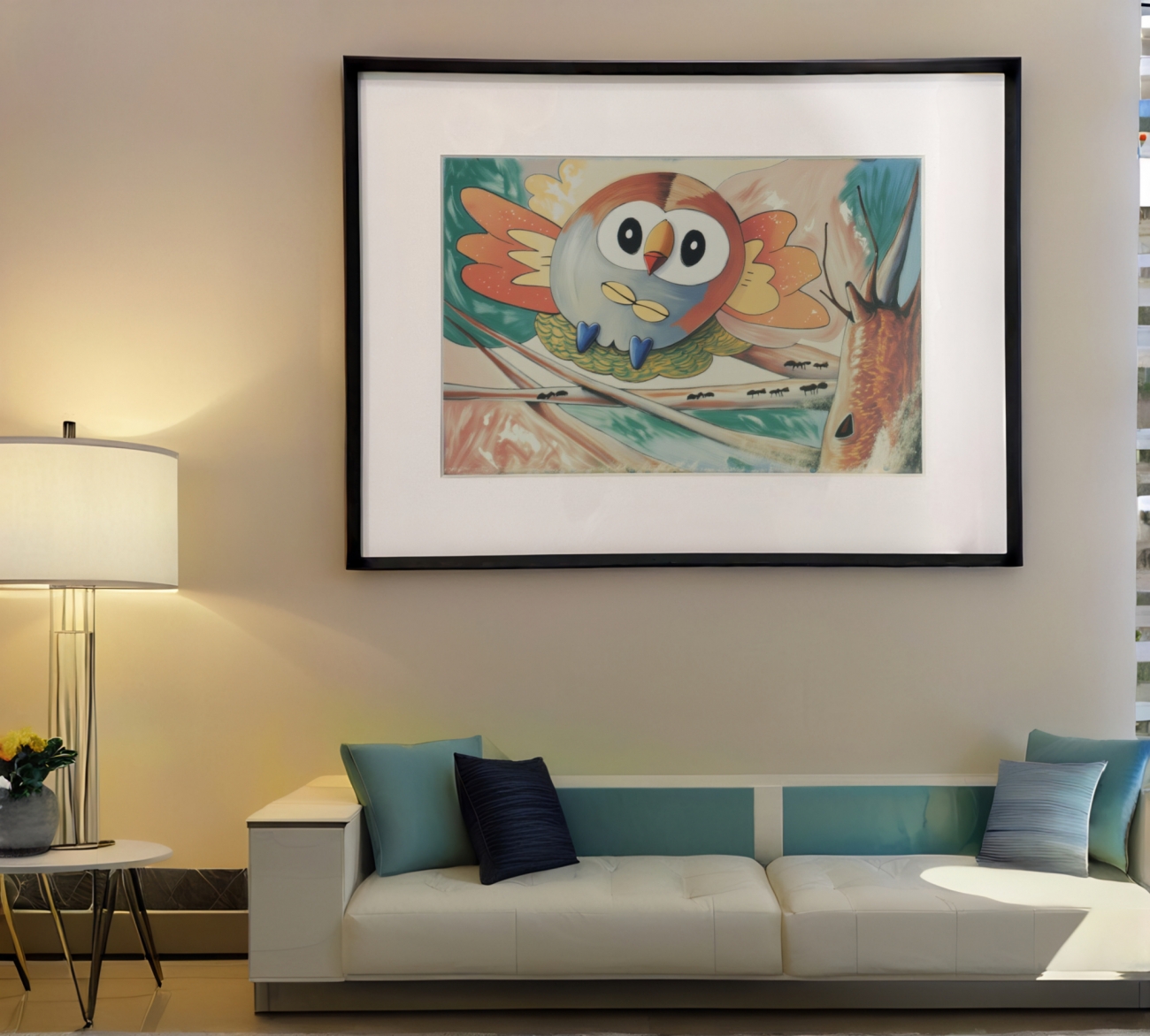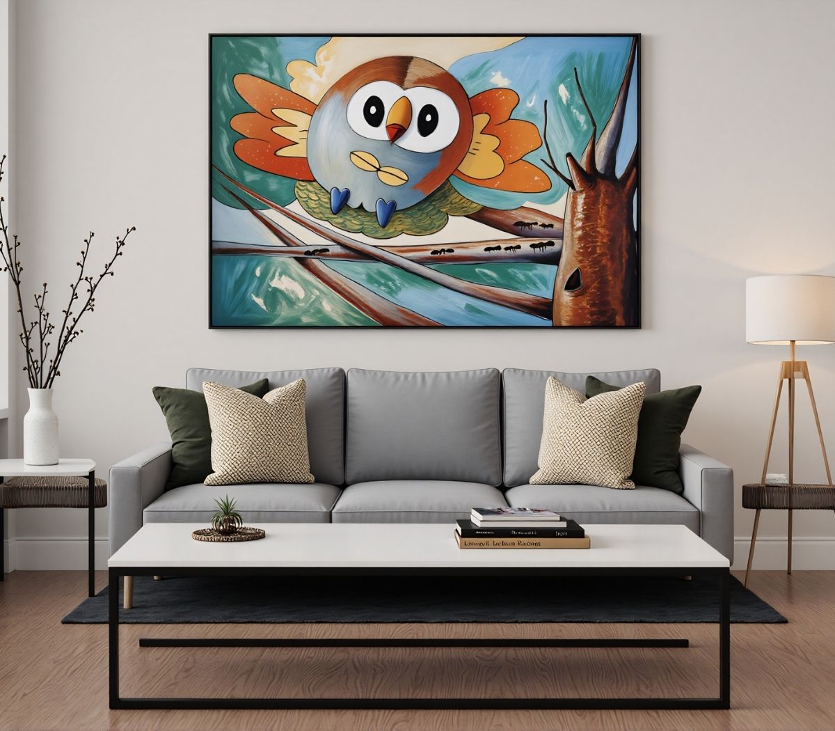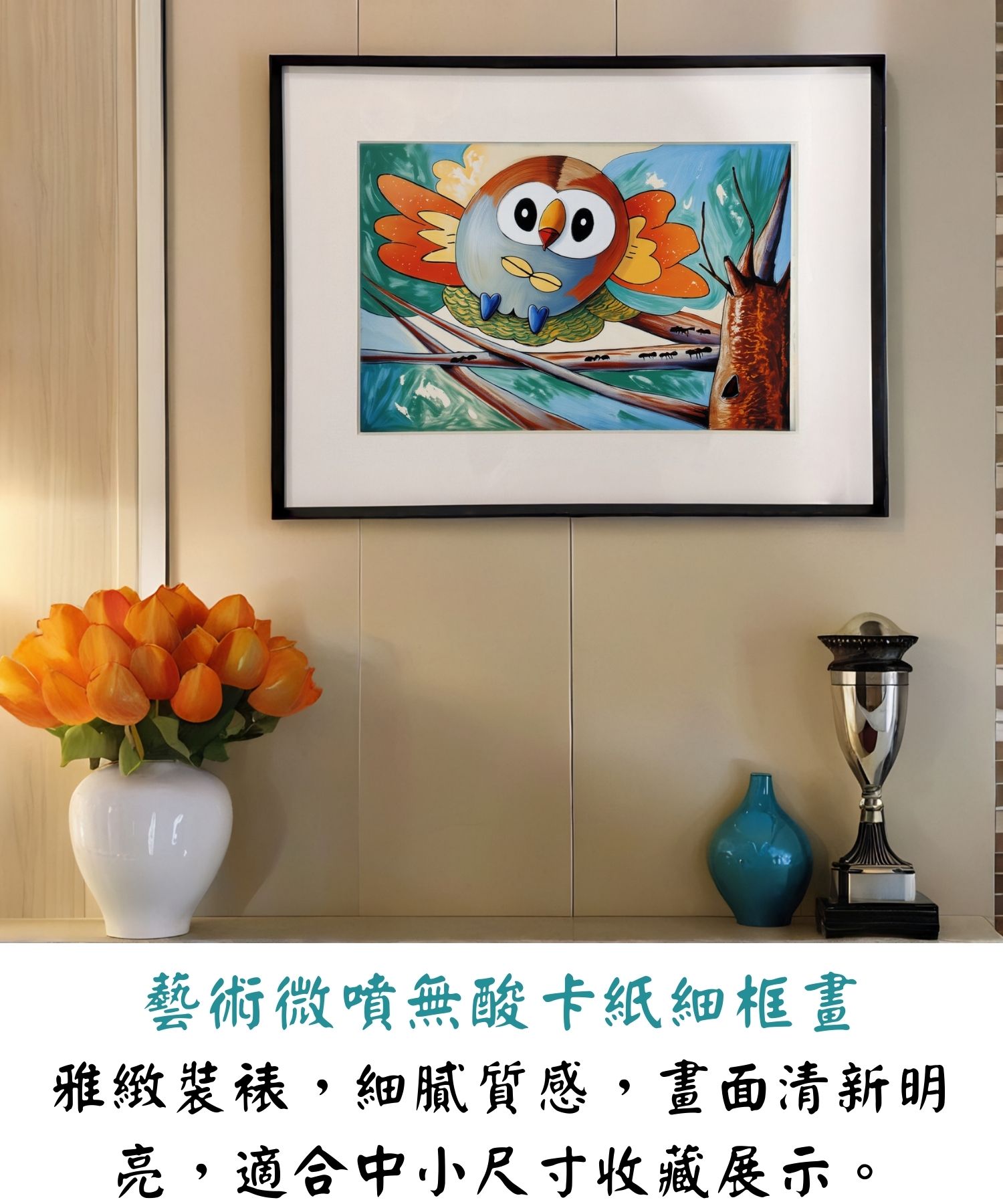 以誇張比例與鮮明筆觸描繪出一隻大眼木木梟,棲息枝頭,專注觀察森林的祕密。牠的羽翼色彩斑斕,與枝上螞蟻的行列相互呼應,增添動態細節,讓畫面更富生命力。整體風格童趣俏皮,如同孩子眼中的自然世界,純真卻充滿探索的節奏。無論是居家空間或童趣氛圍的營造,都能成為獨特亮點。
