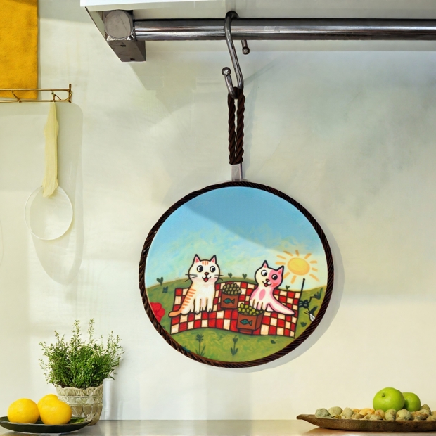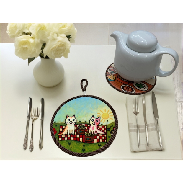 「午後野餐趣」陶瓷隔熱墊以生動插畫描繪兩隻小貓在草地上享受野餐的情景,陽光、紅格子布與悠閒氛圍,讓人一眼感受幸福與放鬆。採用高溫燒製陶瓷面,色彩鮮明耐看,背面搭配軟木防滑設計,安全實用。可作為鍋墊、茶壺墊,也能掛於廚房成為療癒小畫作,是結合功能與藝術的小巧精品。