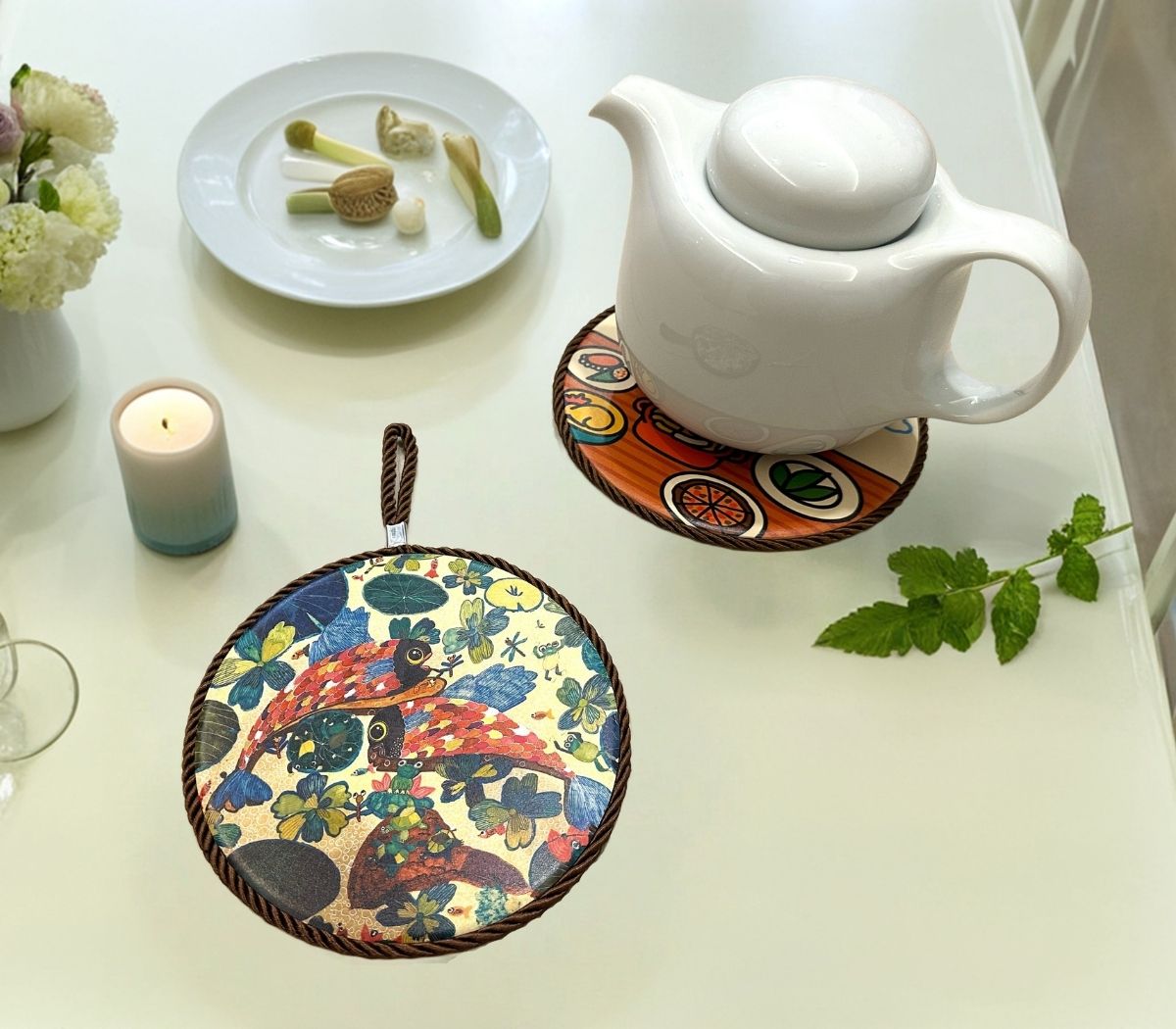 在日常餐桌中注入藝術氣息,每個陶瓷隔熱墊皆源自獨特畫作創意,陶瓷材質細緻耐用,軟木背墊防滑防潮,UV直噴工藝,完整呈現原畫的色彩與筆觸,不僅隔熱實用,更是家居佈置亮點。平整表面搭配手工繩飾,典雅精緻、方便收納。從日常餐桌到朋友聚會,都能增添藝術氛圍,讓烹飪用餐多一分溫度與儀式感。